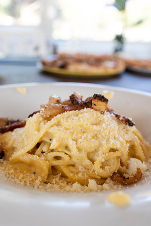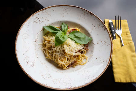 Dish of spaghetti alla carbonara on the table of the restaurant. White plate with typical italian recipe of pasta with bacon, egg, cream sauce and parmesan cheese. Traditional cuisine of Italy.
