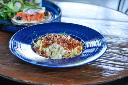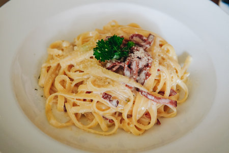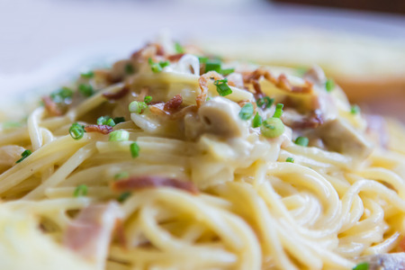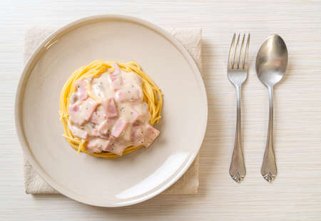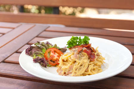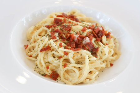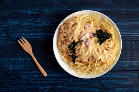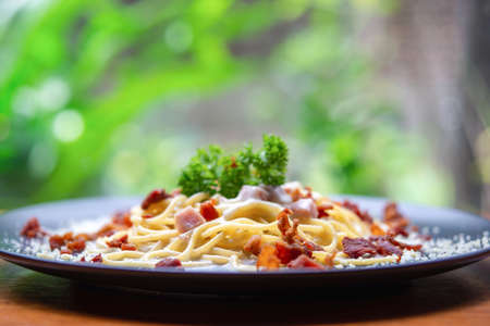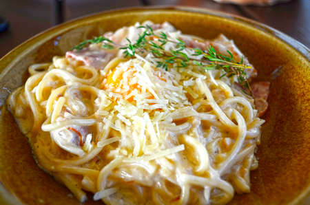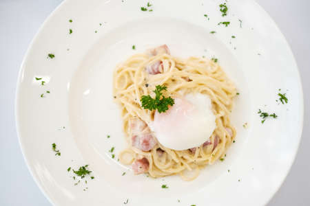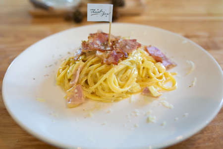 Spaghetti Carbonara with Bacon and Ham in mayonnaise cream sauce for food and drink category