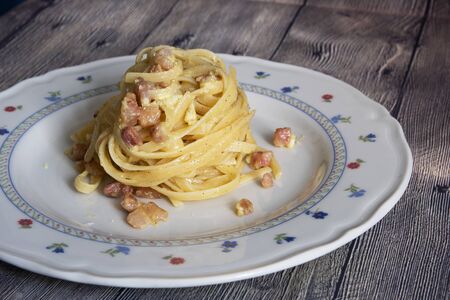 Italian pasta - Spagetti carbonara with pancetta, egg, hard parmesan cheese and cream sauce. in the white plate on woodden table .