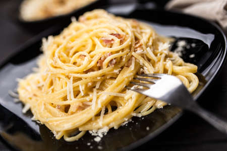 Spaghetti Carbonara with bacon and cheese in black plate on dark background