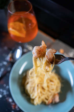 fresh italian carbonara pasta with seafood, shrimps and glass of aperol spritz