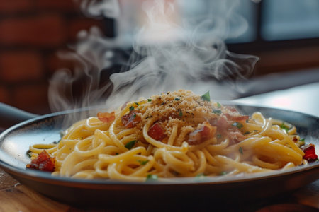A plate of pasta with a lot of smoke coming out of it, showcasing a steaming hot spaghetti carbonara dish, A steaming plate of spaghetti carbonara with crispy pancetta