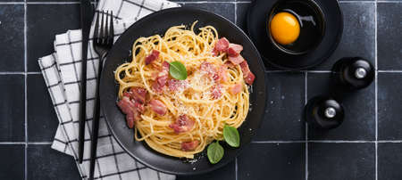 Carbonara pasta. Spaghetti with pancetta, egg, parmesan cheese and cream sauce on old black tile table background. Traditional italian cuisine and dish. Pasta alla carbonara. top view.