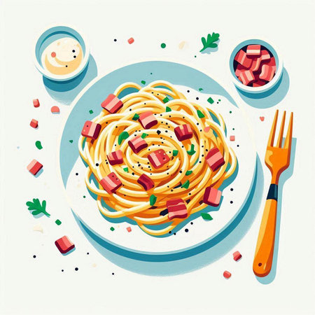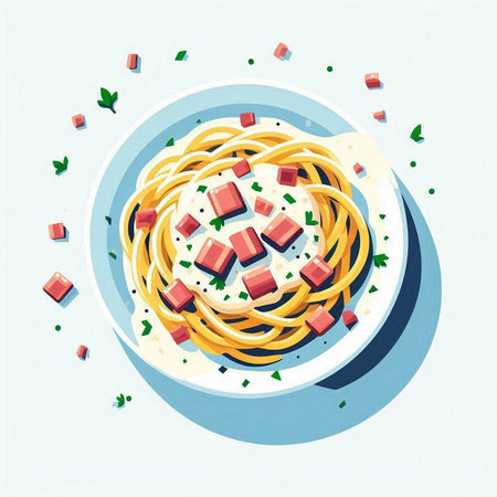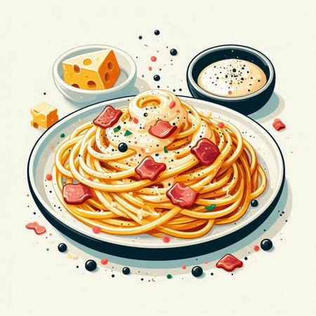 Spaghetti with bacon and cheese on a plate. Vector illustration.