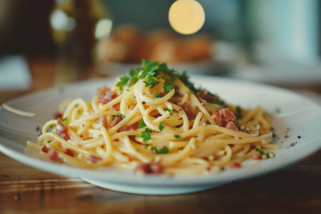 A plate of spaghetti topped with pancetta and garnished with fresh parsley is elegantly presented. The warm ambiance of the restaurant adds to the dining experience.