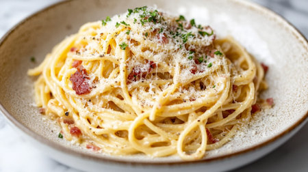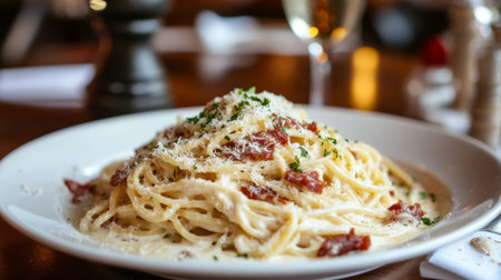 A delicious plate of creamy spaghetti topped with cheese and fresh herbs. Perfect for dinner or a luxurious lunch, this dish offers comfort and flavor.