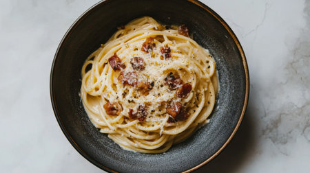An overhead view of a delicious spaghetti carbonara, featuring rich, creamy sauce, bacon bits, and a generous topping of grated cheese, served in a stylish bowl on a white surface.