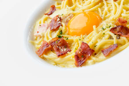 Pasta Carbonara. Spaghetti with bacon, parmesan, cream sauce and egg yolk. Macro close-up isolated on a white round plate. Mediterranean gourmet food