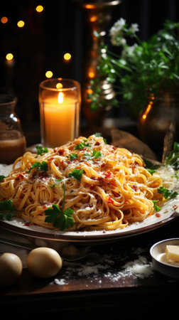 AI Generated. A delicious plate of spaghetti garnished with crispy bacon and melted cheese for a tasty meal