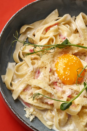 Pasta spaghetti carbonara with egg. Italian cuisine. Recipe. Food