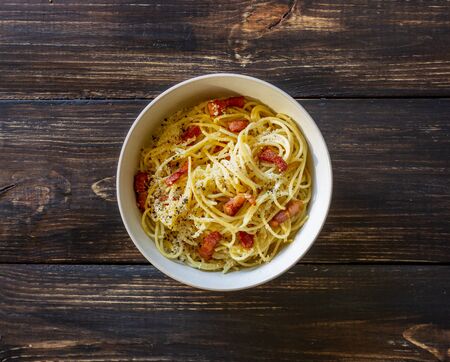 Spaghetti Carbonara with bacon and parmesan on wooden table. Italian food.