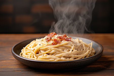 Close up view of steaming bowl of spaghetti carbonara with egg yolk, parmesan, bacon. AI generated
