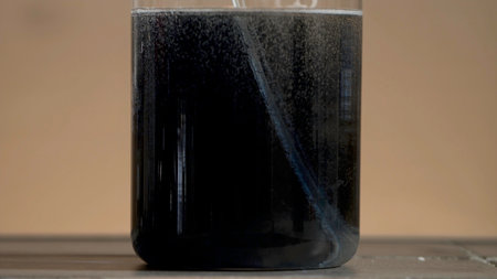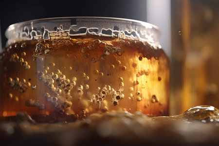 A detailed shot of fermentation bubbles forming under the surface demonstrating the active process of kombucha creation..