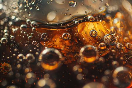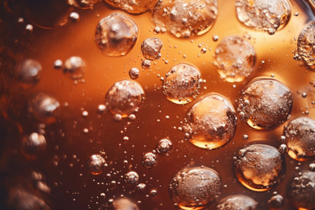 A stunning close-up image showcasing bubbles rising in a dark carbonated beverage, capturing the lively effervescence and intricate details of the glossy surface.
