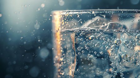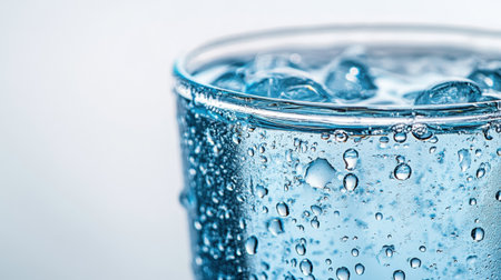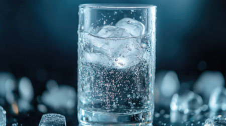 A visually captivating image of a glass filled with sparkling water and ice cubes, illuminated by soft blue light, creating a refreshing and serene ambiance.