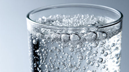 A close-up view of sparkling water showcasing bubbles rising in a clear glass, creating a refreshing and inviting visual perfect for hydration themes.