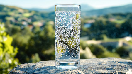 Close-up shot featuring a glass filled with sparkling water, showcasing numerous bubbles. The glass is positioned on a stone surface, with a blurred landscape in background.