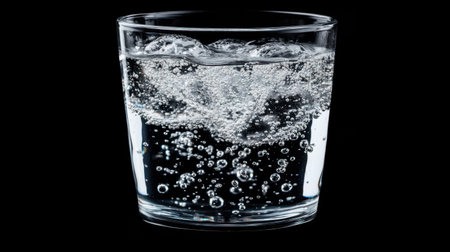 A clear glass filled with vibrant sparkling water showcases bubbles and effervescence against a sleek black background, perfect for hydration and beverage concepts.