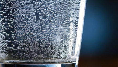 Clear glass filled with sparkling water showcases bubbles in a serene blue setting.