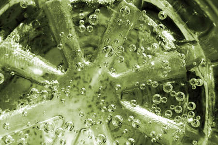 Refreshing lemonade with slices of lime with ice in a transparent sweaty glass cup close-up macro photo