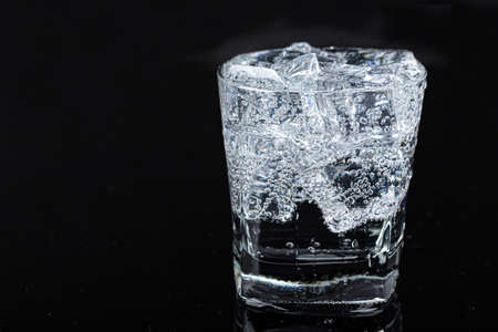 Closeup ice cube glass with sparkling water in slow motion. Liquid with bubbles in clean glass. Ice moves inside mineral water glass in slow motion. Top view black background. Organic cocktail concept