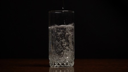A clear glass filled with bright sparkling water, captured with a dark background, showcasing the effervescence and refreshing nature of the beverage in a captivating closeup.