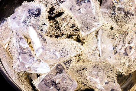 A close-up view of ice cubes floating in crystal clear water with bubbles, creating a refreshing atmosphere ideal for summer drinks and beverage photography.