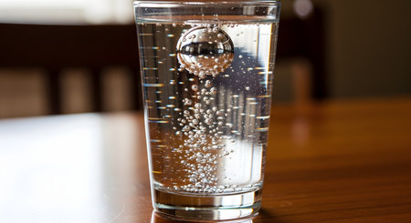 This striking image showcases bubbles rising in clear water within a glass, reflecting themes of purity and refreshment, perfect for beverage or wellness concepts.
