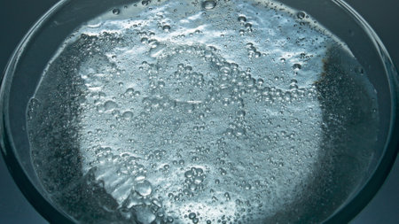A detailed close up of a transparent glass filled with water that has numerous bubbles floating on its surface, Tiny bubbles trapped in a glass of sparkling water, AI Generated