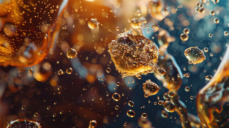 A close-up view of bubbles splashing in a fizzy brown beverage with an energetic vibe