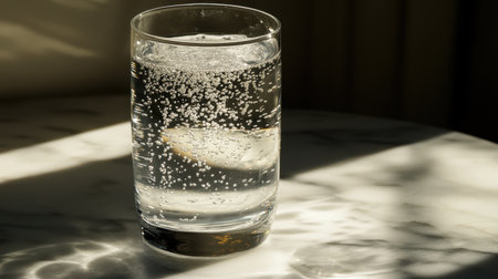 A beautifully lit glass of sparkling water sits on a light marble surface, showcasing bubbles that create a refreshing and tranquil visual perfect for relaxation.
