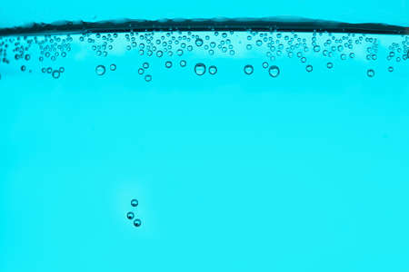 This image showcases a close-up of bubbles in sparkling water, highlighting the refreshment and clarity of the drink against a soft blue background.