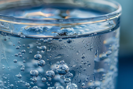 Captivating close-up shot of bubbles rising in a clear glass of sparkling liquid against a serene blue background, symbolizing refreshment and celebration.