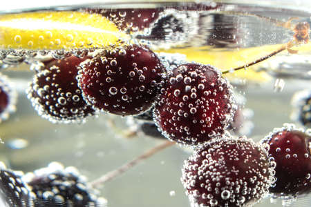Red cherries in sparkling water. Bubbles around the cherries under water.