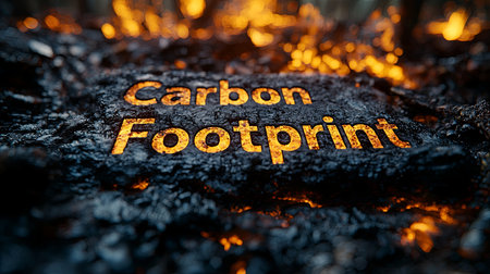 Close-up image of the phrase 'Carbon Footprint' with illuminated text on a fiery and burned surface, symbolizing environmental impact and climate change.