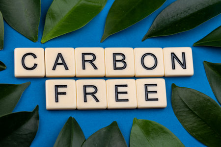 Sentence carbon free composed of letters. Blue background and green leaves. Photo taken under artificial, soft light