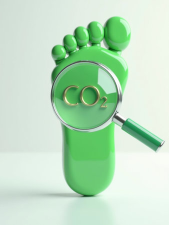 An illustration shows a green footprint with a magnifying glass highlighting the chemical formula CO2. The image symbolizes the analysis of environmental impacts, sustainability, and the influence of human activities on climate.