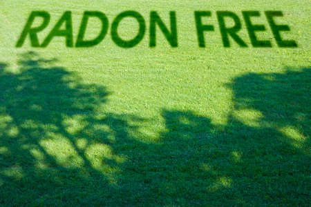 Radon free: land free from the natural dangerous radioactive gas that comes from the earth - concept image with text over a green mowed lawn.