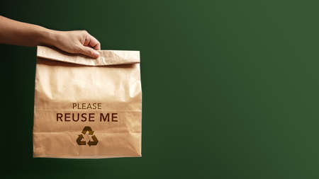 Hand Holding a Recycling Craft Bag. Reduce Plastic Packaging. Zero Waste Products. Environment, Ecology Care, Renewable Concept