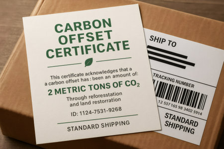 Carbon offset certificate displayed on a cardboard box, demonstrating environmentally conscious shipping and carbon neutrality