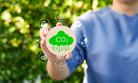 Carbon footprint concept. Carbon emissions, net zero carbon neutral. Woman holding carbon reduction icon. CO2 neutrality, Sustainable, Climate change, Global warming, Greenhouse gas, Renewable energy,