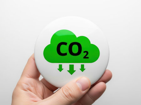 A hand holding a white ball with a green CO2 cloud icon and downward arrows, symbolizing carbon dioxide emission and reduction.