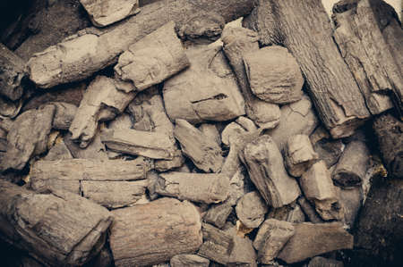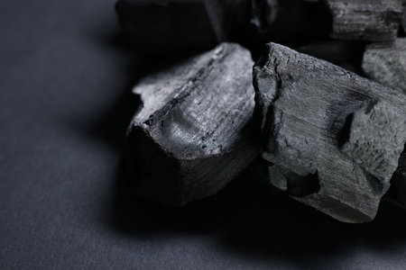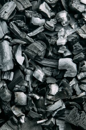 Group of charcoal black color made from real wood in studio close-up shot which use for cooking or absorb odor in room or refrigerator. And use in some cosmetic industry.