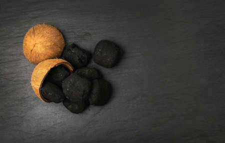 Coconut coal briquette on black background. Pressed charcoal for braai, coconut barbecue coal, bbq briquettes, grill charcoal top view