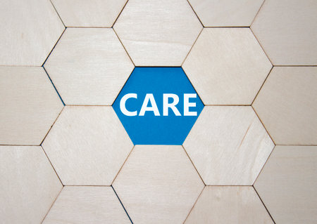 Care symbol. Concept word Care on wooden comb puzzle. Beautiful blue background. Business and Care concept. Copy space.