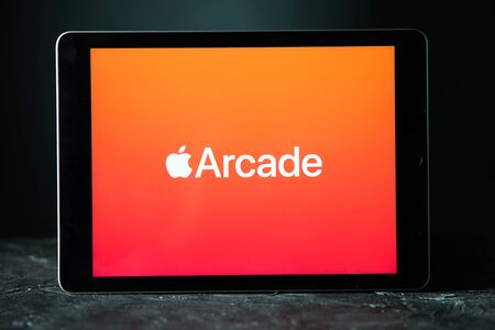 Bishkek, Kyrgyzstan - September 19, 2019: Woman holds the new iphone in portrait mode and subscribes to apple arcade with orange background