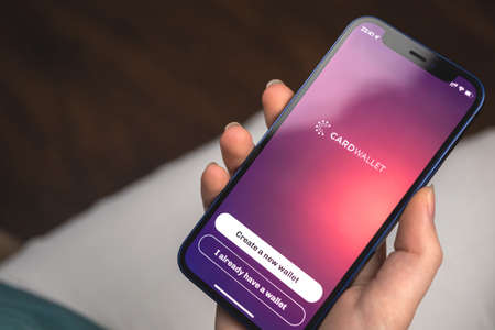 Kharkov, Ukraine - January 10, 2022: Woman uses CardWallet ADA Cardano Wallet app. Hand with Apple iPhone 12, mobile phone screen with logo