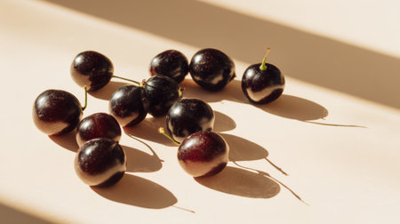 A collection of fresh dark cherries positioned creatively on a light background, showcasing their rich color and texture while casting soft shadows for a calming aesthetic.