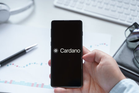 Russia Moscow 06/08/2021 Logo of Cardano coin in mobile phone. Cryptocurrency token ADA. Trading blockchain platform to buy, sell on decentralized exchange DEX. Digital money.Business, investing.
