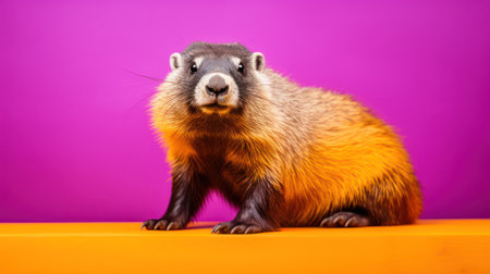 A cute groundhog on a festive spring day. Groundhog Day. A groundhog with fluffy fur. Landscape view